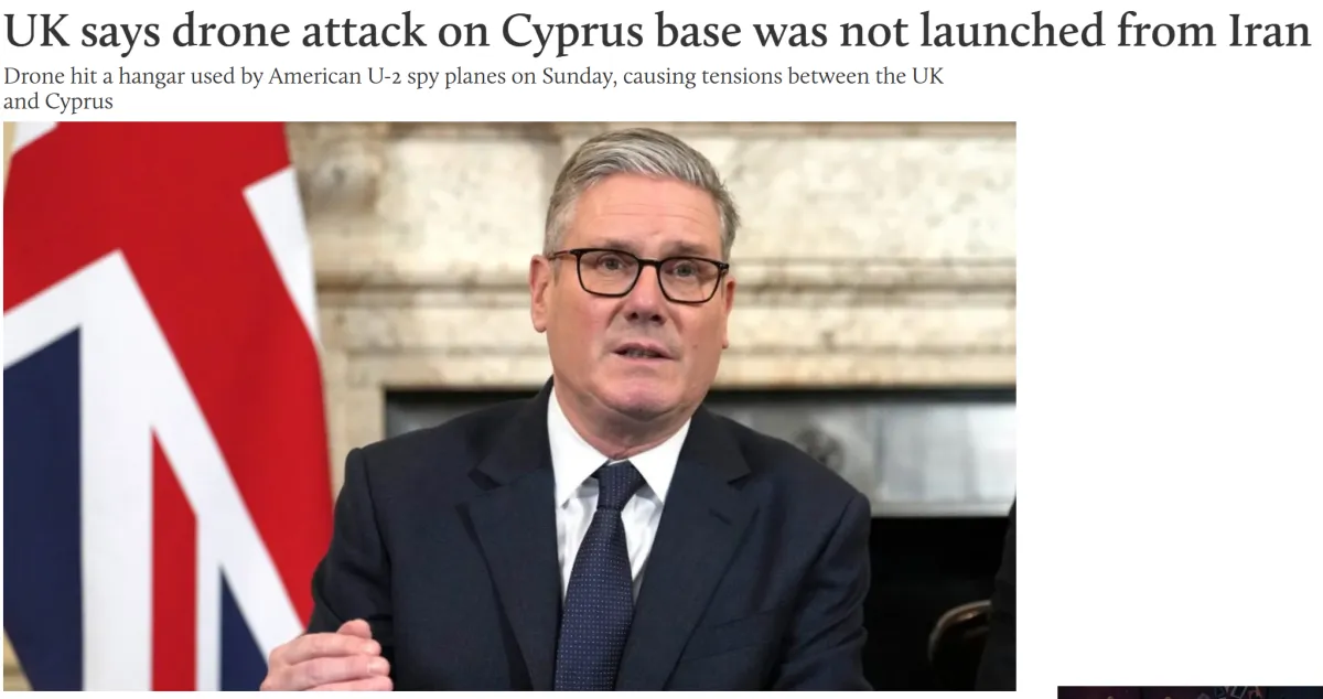 Following the alleged arrest of Mossad agents in Quatar and Saudi Arabia. The UK reported how attacks on their UK base in Cyprus did not orinagate from Iran. This implication could me that once again, allegely in my opinion, Israel was attempting to create another false flag in UK to pull them into the war with Iran. This is becoming a pattern that I think the world will start reconsidering the reasons why America was also pulled into wars in the Middle East after a sudden "attack".